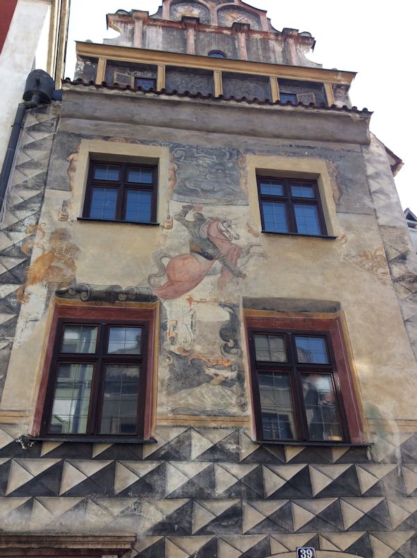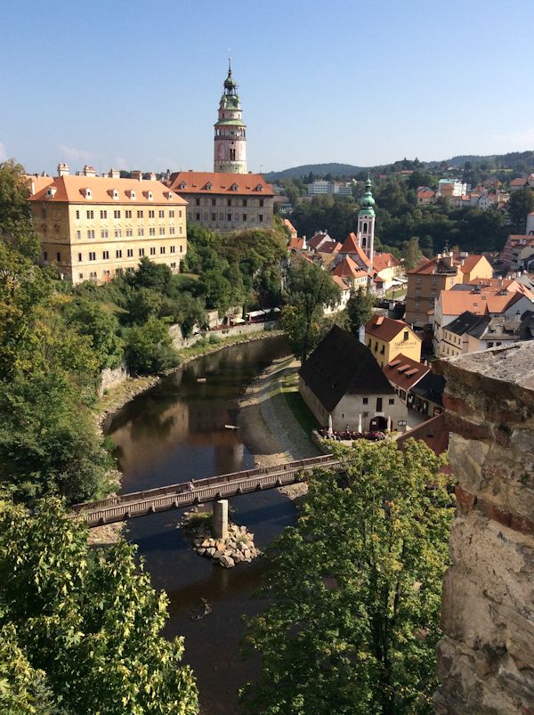 We took an all-day tour from Prague which entailed about a two-hour drive through the lovely Bohemian countryside to our destination. We got off the bus at the castle and after a visit to the loo and a photo stop, we followed our guide down to the town along the river. Lots of cobblestones, of course.