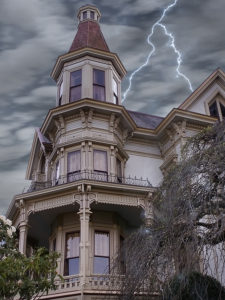 stern looking victorian mansion weathers a lightening storm gives this scene a haunted feel.