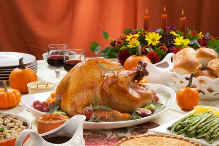 Roasted turkey on a server tray garnished with fresh figs grape kumquat and herbs on fall harvest table. Red wine side dishes pie and gravy. Decoraded with mini pumpkins candels and flowers.