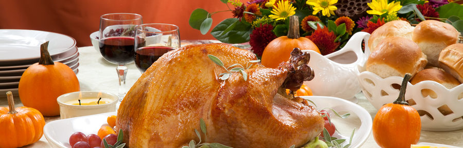 Roasted turkey on a server tray garnished with fresh figs grape kumquat and herbs on fall harvest table. Red wine side dishes pie and gravy. Decoraded with mini pumpkins candels and flowers.